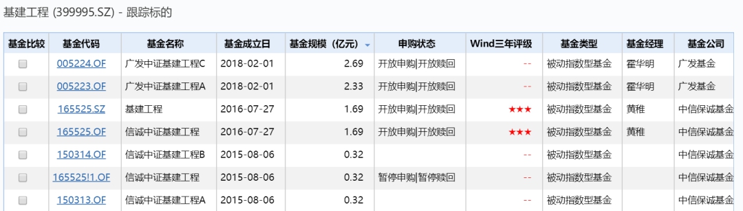 嗯,这个是纯基建的指数,跟踪标的有这几个被动指基: