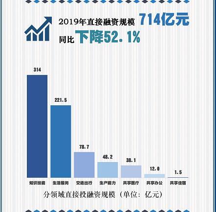 值得注意的是,直接融资规模也大幅下降。2019年中国共享经济直接融资规模为714亿元,同比下降52.1%。其中知识技能、生活服务和交通出行领域直接融资规模位居前三,分别为314亿元、221.5亿元和78.7亿元。