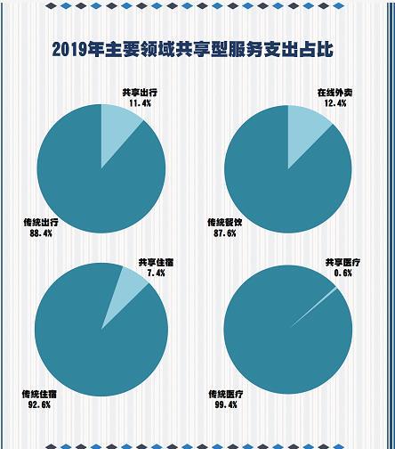 2019年,网约车客运量占出租车总客运量的比重达到37.1%,比上年提高0.8个百分点;在线外卖收入占全国餐饮业收入的比重达到12.4%,相比上年提高1.5个百分点;共享出行服务支出占城镇居民交通支出的比重为11.4%,较上年下降0.3个百分点;共享住宿收入占全国住宿业客房收入的比重达到7.3%,比上年提高1.6个百分点;共享物流收入占公路物流总收入的比重达到1.65%,比上年提高0.26个百分点。