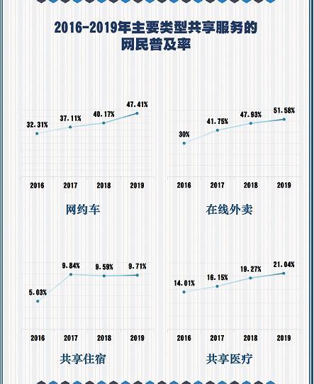 普及率方面,2016-2019年,网约车用户在网民中的普及率由32.3%提高到47.4%;在线外卖用户普及率由30%提高到51.6%;共享住宿用户普及率由5%提高到9.7%;共享医疗用户普及率由14%提高到21%。