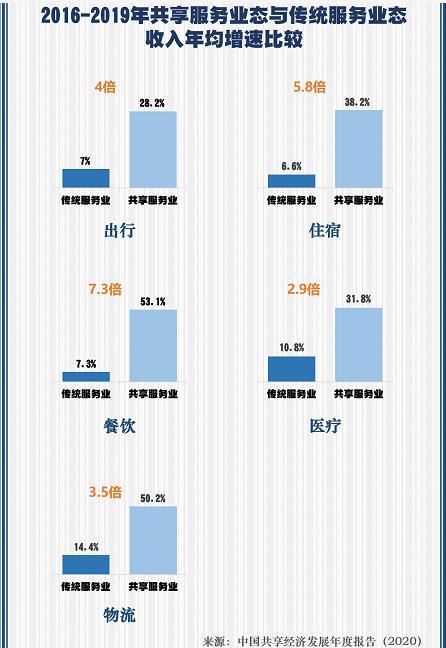 2016-2019年主要共享服务业态收入的平均增长速度大幅高于传统服务业态,其中餐饮领域达到7.3倍,住宿领域达到5.8倍。