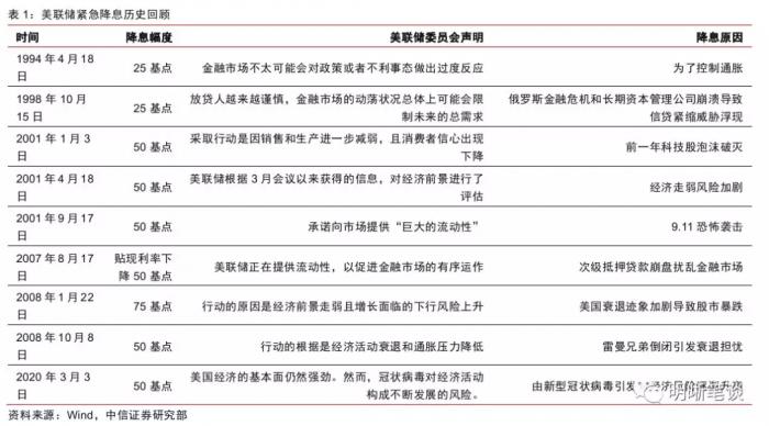 同时美联储还表示委员会正在密切监测事态发展及其对经济前景的影响,将使用其他工具并采取适当行动支持经济。从本次决策的委员会投票情况来看,委员全票通过本次紧急降息。在距离三月份议息会议仅两周左右的时间,美联储突然采取行动,且委员意见高度一致,反映出当前公共卫生事件带来的风险紧急且严重,而从降息的幅度来看,本次采取50BP的利率区间下调,也与之前大部分紧急降息情况一致。