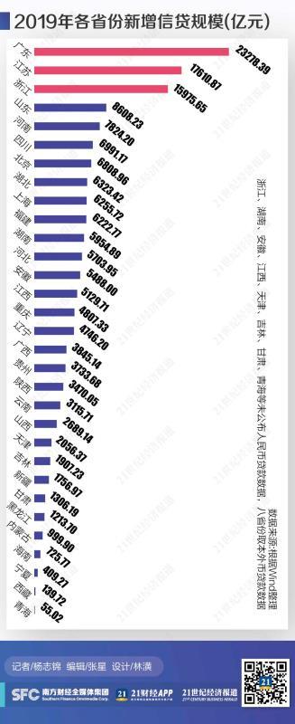 21世纪经济报道记者根据Wind数据梳理发现,2019年新增人民币贷款规模(下同)最高的三个省份为广东、江苏、浙江,三省合计新增信贷规模5.68万亿,占全国增量的三分之一。(由于浙江、湖南、安徽、江西、天津、吉林、甘肃、青海等省份未公布人民币贷款数据,八省份取本外币贷款数据。本外币贷款和人民币贷款数据相差不大,因此对相关计算结构影响轻微。)