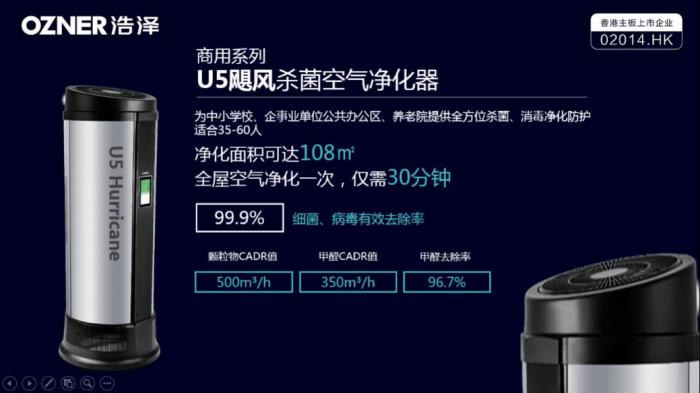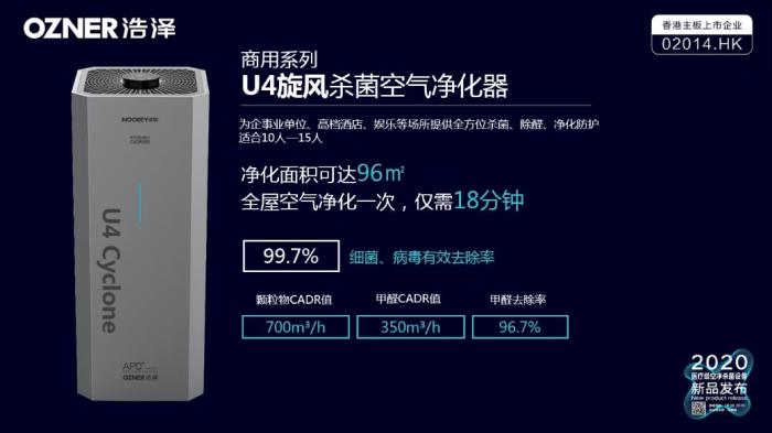 U4和U5也是本次发布的新款产品,针对企事业单位的办公平台、中小学校的教室、高档酒店的会议室和小宴会厅等公共场景的解决方案。这类场景一般面积在50-200平方米左右,聚集人数少则20,多则上百人。人员的密集度较高、接触频繁且有流动性,容易造成病菌交叉感染。U4、U5(有新风功能)杀菌空气净化器净化效能高,仅需20分钟左右就可将室内空间里的细菌、病毒、颗粒物等净化干净。