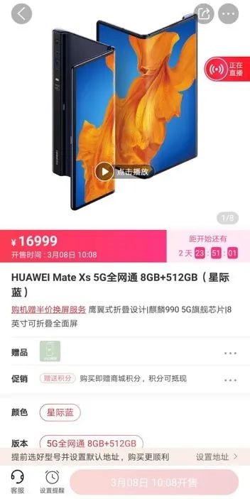 华为 Mate Xs于2月26日10:08开启预约,截至3月4日晚,MateXs在华为商城、京东、天猫三大平台的总预约量超过一百万台,其中华为商城的预约量超64万部,京东和天猫的预约量分别超30万和18万部。