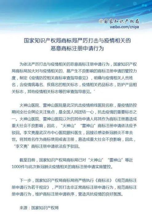 国家知识产权局表示,为依法严厉打击与疫情相关的恶意商标注册申请行为,商标局加大对与疫情相关的、易产生不良影响的商标注册申请的管控力度,制定《疫情防控相关商标审查指导意见》,明确与疫情相关人员姓名,含疫情病毒名、疾病名的相关标志,疫情相关药品标志,防护产品相关标志,其他疫情相关标志等的审查指导意见。