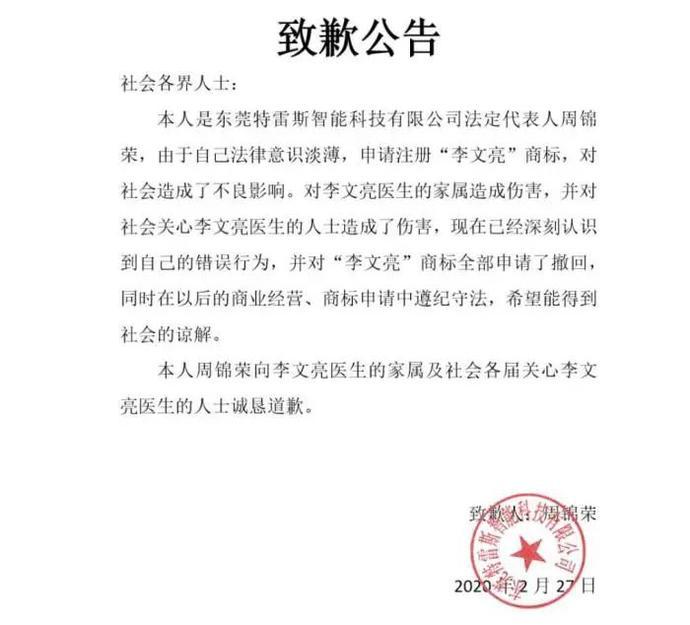 在全国为李文亮医生的逝世哀悼时,却有公司在这一天提交了“李文亮”商标申请。据报道称,针对有公司在李文亮医生去世当天抢注“李文亮”商标一事,长沙市知识产权局一位副局长正带队现场调查此事,该局对此事高度重视,已责令企业撤销商标申请,并对该企业违法行为展开调查。