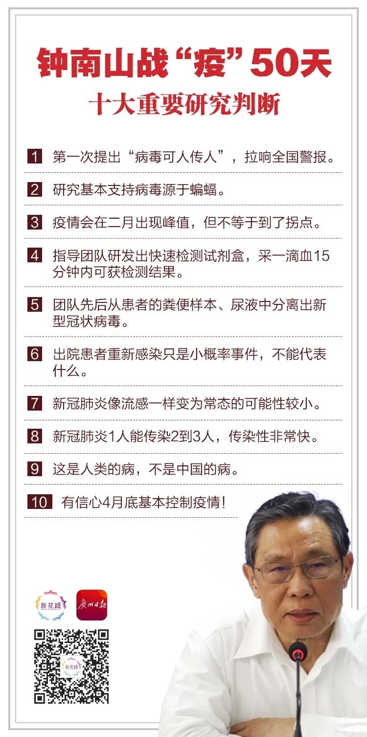 1月18日夜驰武汉至今,钟南山战“疫”已50天,整理媒体报道可以发现,50天来他为疫情奔波的行程满满当当,始终冲在前线,几乎没有休息过。在广州新闻专题通气会上发出“4月底基本控制疫情”的信心后,又马不停蹄为欧洲呼吸学会介绍中国经验。最新消息显示,在他参与指导下,国际首个非转基因新冠肺炎小鼠动物模型成功建立。