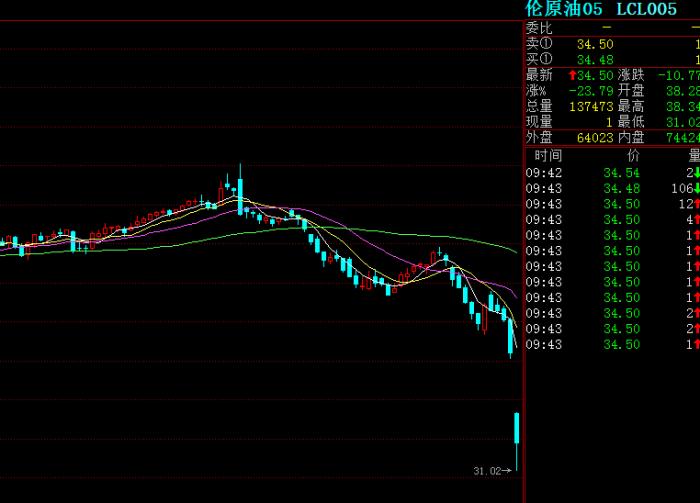 继上周五伦敦原油期货大跌8.5%,至45.98美元/桶后,3月9日亚太时间开盘后,直接跳空大幅低开,最低跌至31.02美元/桶。