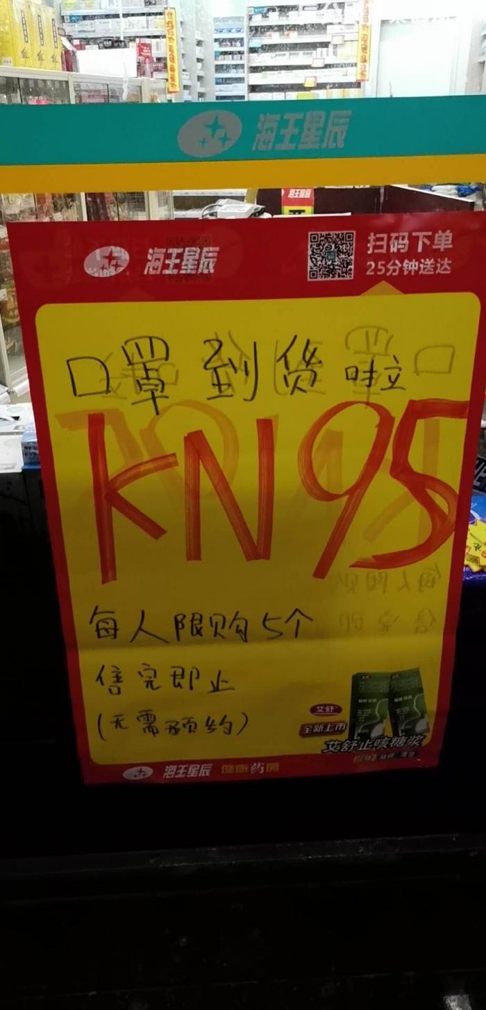 不过,3月7日,黄琳在周边散步的时候,却发现一个药店贴出了广告:“口罩到货啦 KN95 每人限购5个 无需预约 售完为止”。
