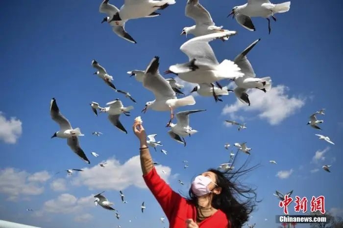3月7日,市民在昆明市海埂大坝喂红嘴鸥。随着红嘴鸥归家日期的临近,不少市民来到海埂大坝上喂鸥,送别“春城”的老朋友。中新社记者 刘冉阳 摄