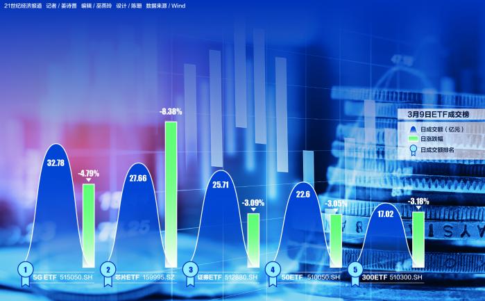 譬如3月9日,虽然华夏5G ETF、华夏芯片ETF仍然是成交额最高的股票型ETF,但国泰证券ETF、华夏上证50ETF、华泰柏瑞沪深300ETF三只ETF的成交额挤进前五位,且三只ETF的成交额均较前一个交易日继续增长。