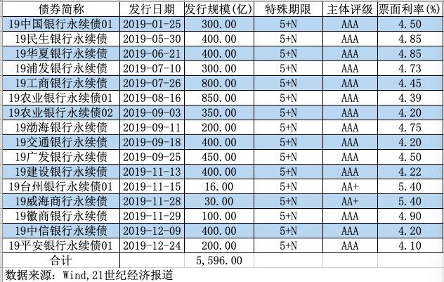 相比去年,今年获批发行永续债的中小银行明显增多。记者根据Wind统计发现,2019年共有15家银行发行5596亿永续债,其中小银行仅有微商银行、威海市商业银行、台州银行三家。
