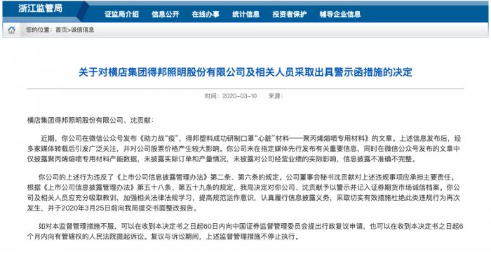 3月10日,浙江证监局指出,“近期,得邦照明在微信公众号发布《助力战“疫”,得邦塑料成功研制口罩“心脏”材料——聚丙烯熔喷专用材料》的文章。上述信息发布后,经多家媒体转载后引发广泛关注,并对公司股价产生较大影响。公司未在指定媒体先行发布有关重要信息,同时在微信公众号发布的文章中仅披露聚丙烯熔喷专用材料产能数据,未披露实际订单和产量情况,未披露对公司经营业绩的实际影响,信息披露不准确不完整。”