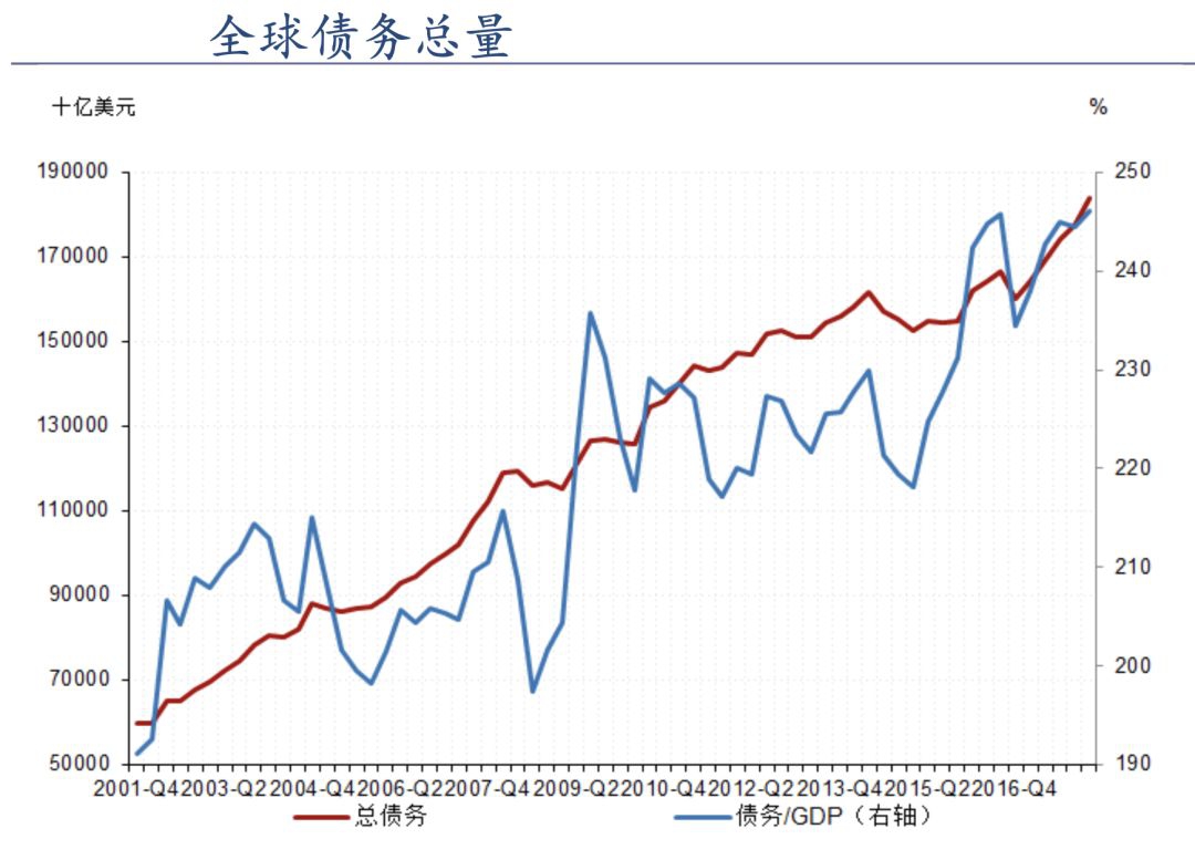 全球债务,从2008年金融危机后,就没有真正削减过,无论是绝对规模,还是占GDP的比重,一直飙升。