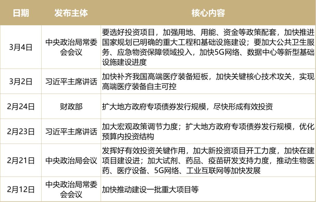 此次疫情对一季度经济增长影响非常明显,因此,中央政治局会议多次强调要加大基建投资。3月4日,中央政治局常委会再次提到“要选好投资项目,加强用地、用能、资金等政策配套,加快推进国家规划已明确的重大工程和基础设施建设”、“要加大公共卫生服务、应急物资保障领域投入,加快5G网络、数据中心等新型基础设施建设进度”等等。地方政府方面,云南、四川、福建、陕西、河南、河北等地公布了计划投资额度,累计达到30万亿元以上。
