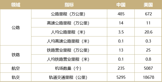 譬如,我国公路总里程485万公里,铁路总里程13万公里,机场235个,而美国的相同指标分别是我国的1.4倍、1.9倍和21.6倍,可以看出,我国的交通基础设施建设仍有较大增长空间。