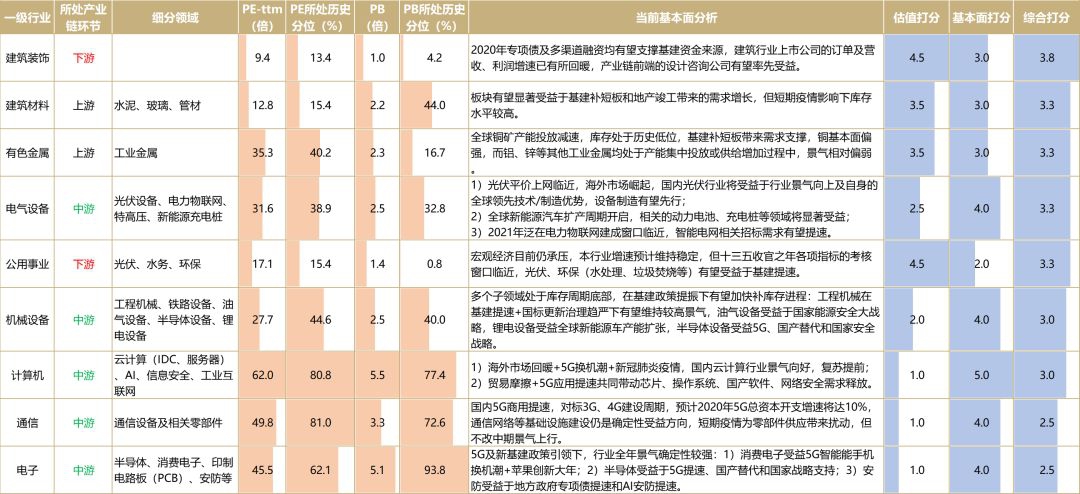 对比新老基建产业链各行业的估值和基本面可以发现:新基建领域基本面景气度较高,但预期已在股价上反映比较充分,计算机、通信行业PE已处于近十年来波动区间的80%分位水平。而传统基建产业链如建筑、建材、电力设备、环保、工程机械等估值更有优势,性价比更高。