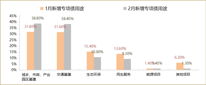图5:2月新增地方政府专项债中有77%投向了基建领域,较1月提升14pct