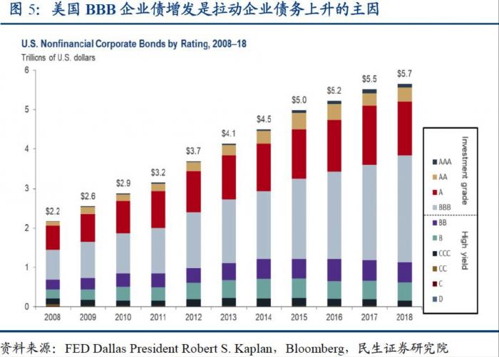 BBB企业债占比上升快,多数企业发债不为发展。企业债务主要由债券和贷款组成。在债券方面,美国非金融企业债务总额从2008年的2.2万亿美元上升至2018年的5.7万亿美元,主要增长点为投资级别债务,特别是BBB企业债。BBB企业债属于最低投资级别债券,仅仅高于高收益级别(垃圾债)一个等级。一旦企业基本面恶化并遭遇评级公司下调其评级,还债压力将迅速上升,出现违约现象。BBB企业债在过去十年里增加了近2万亿美元,占比从2008年的36.4%上升至2018年的47.4%。