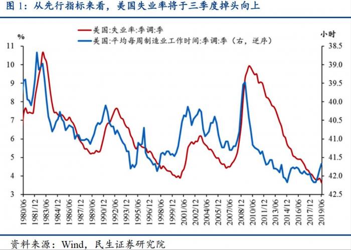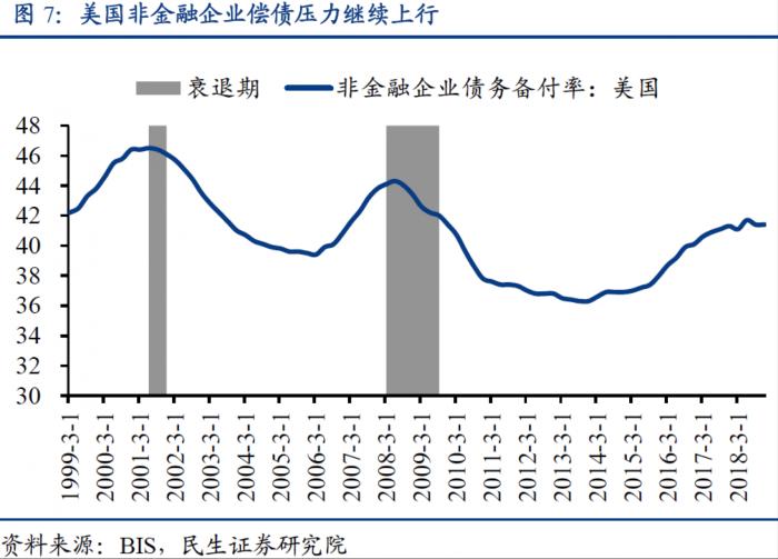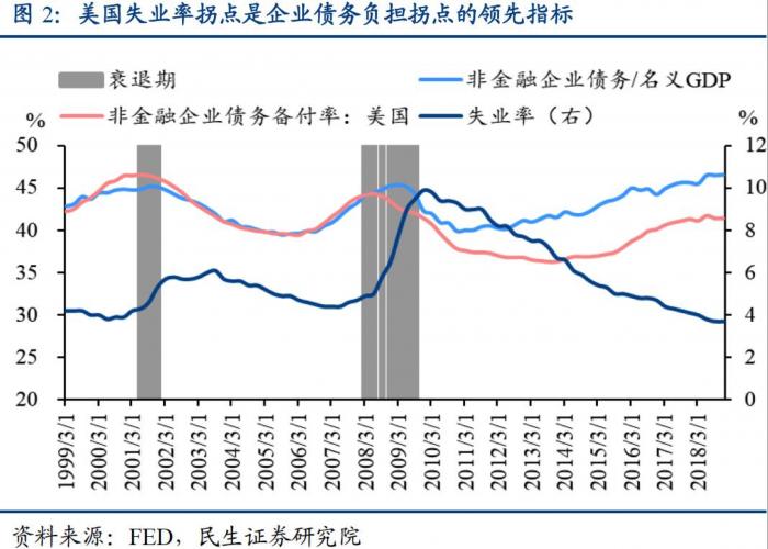 从数据来看,美国失业率月度低点已于2019年4月份出现,为3.58%,5-7月分别为3.62%、3.67%、3.71%,连续3个月上升。我们预计,今年底美国失业率将升至4%左右,明年将进入加速上升阶段。美国企业部门债务成为重要风险源。在美国失业率拐点判断的基础上,可以发现,美国失业率触底回升是企业债务负担触顶的领先指标,其上升趋势形成领先债务负担顶点三个季度左右。
