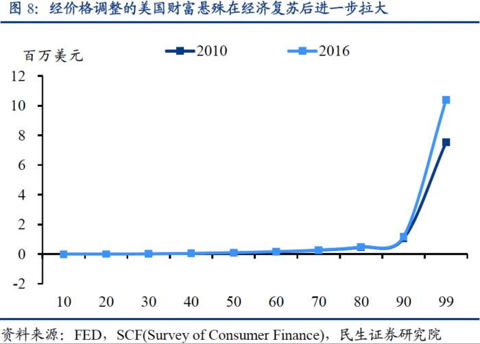 财富和收入差距扩大,民粹主义或将愈演愈烈,美国财富和收入差距在金融危机后继续扩大。正如上文所言,标准普尔500十年内增长接近三倍,只要在早期进入股市就可以使财富成倍扩张。毫无疑问,这对美国精英阶层是非常利好的,普通百姓一般没有余钱投资股市。因此,美国财富悬殊进一步拉大,中位数从2010年到2016年仅增加约1.3万美元,而90%分位数同期增加约14万美元,财富增长最明显的是99%分位以上的人口。