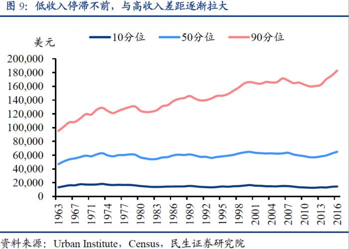 同样的事情发生在劳动力市场,低收入增长长期处于停滞状态,中等收入也只是略有上升,上层收入在危机后有显著提升,2016年高收入薪酬是低收入薪酬的13倍左右。