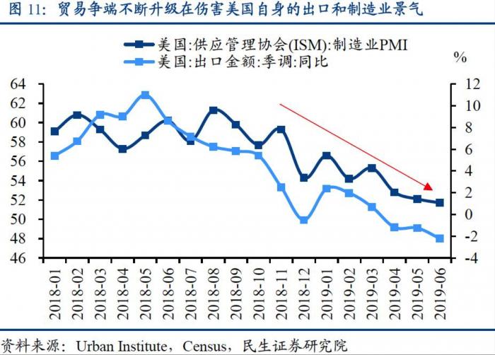 特朗普上任后相继提出了保护主义及反全球化经济等政策。再次,经济下行压力加剧美国保护主义,全球贸易争端不断升级,美国保护主义转嫁国内部分压力。保护主义不仅会伤害全球经济前景,而且也给美国自身的出口和制造业带来伤害,自2018年下半年开始美国出口同比增速持续下降,制造业PMI指数也是不断下降。