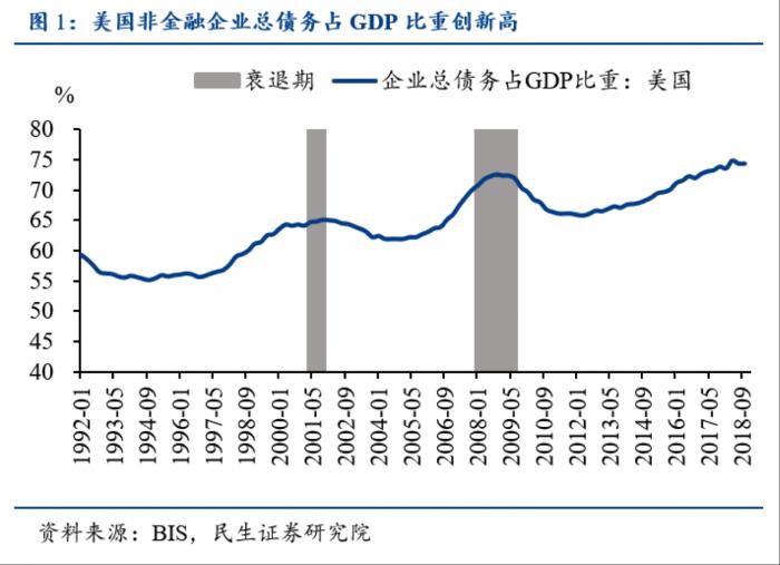 从上两个峰值来看,2008年的峰值低于2001年的峰值,所以现阶段的峰值存在低于2008年峰值的可能性,意味着非金融企业距离去杠杆阶段会更近。如果这一轮峰值等于2008年峰值,我们测算美国企业债务压力可能将在2020年三季度触顶。根据BIS的计算公式,假设债务到期日(BIS默认为13年)和债务利率(BankPrime Loan Rate)保持不变,我们保守估计债务季度年化增速为5%(BIS数据显示2011年至2018年的平均增速为10%,后阶段增速受周期因素影响可能会慢于复苏阶段),名义GDI年化季度增速为4%(2011年至2018年名义GDI平均增速,后阶段增速慢于复苏阶段),则从2018年四季度的41.4达到2008年二季度的44.3需要7个季度(速算公式N=ln(44.3/41.4)/0.01=7),也就是2020年的三季度。我们在这里没有考虑降息和债务增速之间的动态均衡关系。如果利率下降吸引企业加速举债,叠加经济增速放缓加剧,顶部可能会来得更快一些。