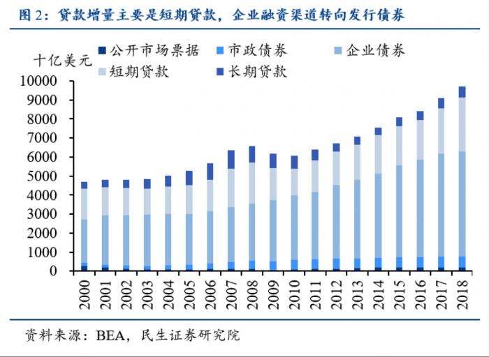 总量上看,企业债务规模从2010年的约6万亿美元增至2018年的9.7万亿美元。融资渠道上看,2018年银行贷款仅在2008年基础上增加了约4000亿美元,其中大部分为短期贷款;企业债券市场融资在同期内一共增加了约2.7万亿美元,几乎全部增量都来自于发行债券(图2)。