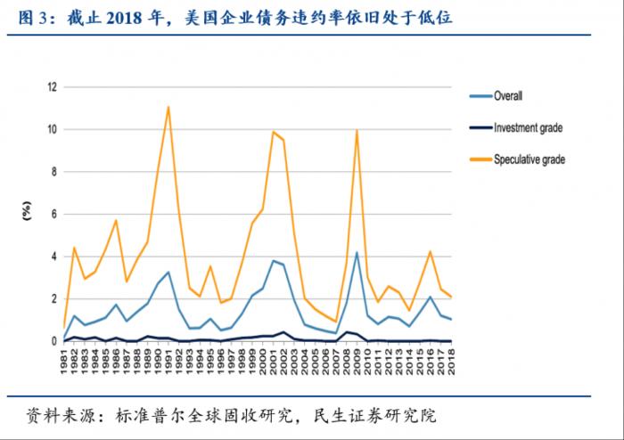 企业债券质量下滑,BBB占比大幅上升。随着规模扩张,企业债券质量逐渐下降。最低投资级别的BBB债券既能满足部分机构的评级要求,又能提供较高的收益。因而,BBB企业债在过去十年里增加了近2万亿美元,占比从2008年的36.4%上升至2018年的47.4%。目前,债券违约率依然显著低于危机时的峰值。