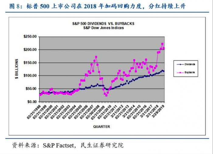 美国上市公司通过回购与分红推高股价。标普500股票回购处于历史高位,工业产出增速再现下滑趋势。上市公司发债融资用于研发生产来提高生产率是一件好事;但是用于股票回购和提高分红来提升股票吸引力则有待商榷。根据标普500统计显示,上市公司从2017年三季度开始加大回购力度,连续6季度回购金额上升,并在2018年四季度达到最高值2223亿美元;股票分红亦是如此。