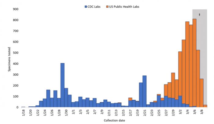 美国疾病预防控制中心(CDC)数据显示,截至周一,CDC的实验室和美国公共卫生实验室有约8500人接受了新冠病毒检测(但目前各州和私营部门实验室也在加大检测力度)。美国卫生部官员表示,覆盖75000人的检测工具已发送至各地公共卫生实验室,超过100万份检测工具已发送至医院等其它地方。