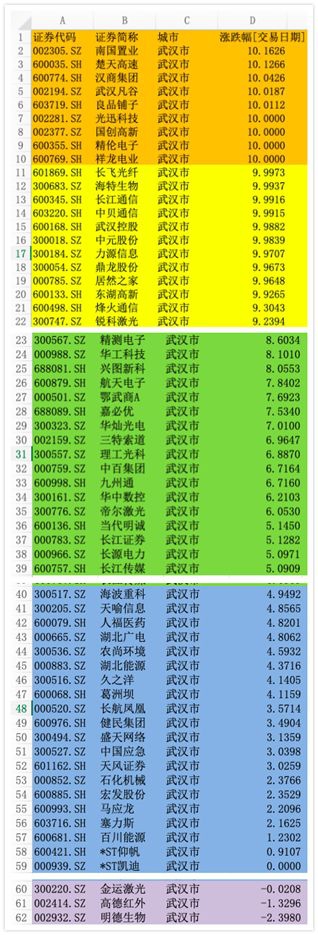 武汉当地A股公司中,今日除了高德红外(002414)、明德生物(002932)下跌1%-2%,金运激光(300220)微跌0.02%之外,其余58家A股公司均是股价飘红。