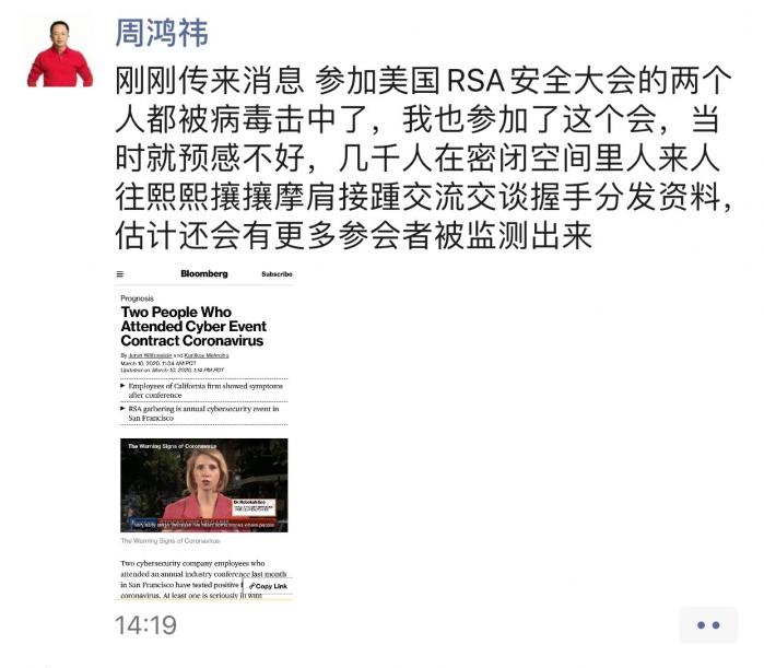 针对这一消息,360公司创始人周鸿祎发布朋友圈称,他也参加了这个会议,并表示,“当时就预感不好,几千人在密闭空间里人来人往熙熙攘攘摩肩接踵交流交谈握手分发资料,估计还会有更多参会这被监测出来。”