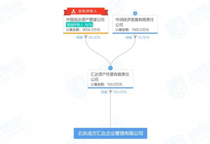 从股权上看,成方汇达由汇达资产托管全资拥有,汇达资产托管由中国信达资产管理股份有限公司(下称“中国信达”)持有90%股权,由中润经济发展有限责任公司(中国信达的全资附属公司)持有10%股权。