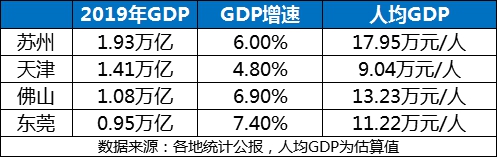 不过,佛山东莞的GDP增速更猛,都在7%左右。而苏州只有6%,天津仅4.8%。