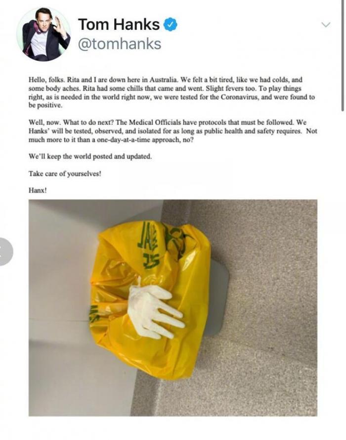 3月12日,美国演员汤姆 · 汉克斯和丽塔 · 威尔逊夫妇向媒体发布声明称,他们在澳洲拍摄新片时确诊感染新冠肺炎。“ 我们感到有点累,就像我们得了感冒和一些身体疼痛。丽塔有些反反复复的寒意,也有些轻微发烧。" 于是他们做了检测,发现新冠病毒呈阳性。汤姆 · 汉克斯表示,将按照公众健康和安全的需求进行观察和隔离。