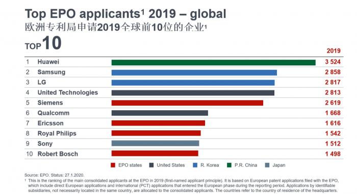 值得注意的是,从专利指数报告看,华为2019年在欧洲专利申请量排名第一,达到3524件。来自韩国的三星和LG分别以2858件和2817件位列第二和第三。