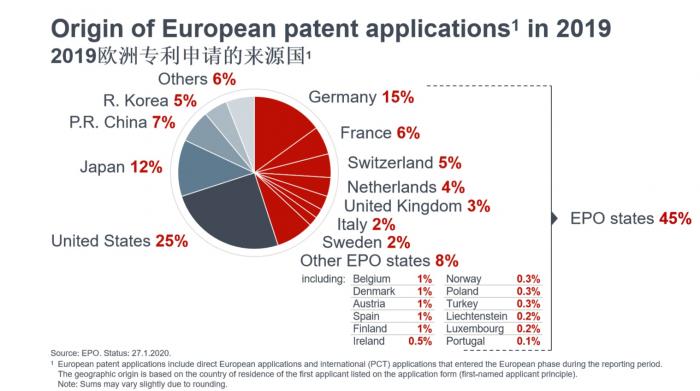 图为:2019年欧洲专利申请的来源国 来源:央视网客户端