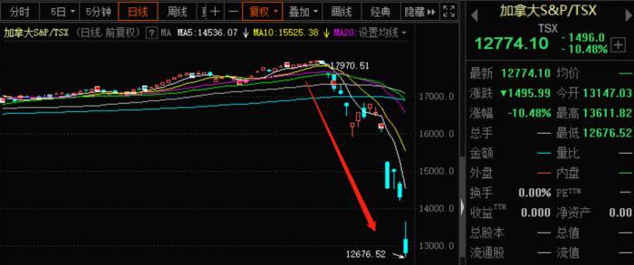 紧随欧股暴跌10%、美股二度熔断的步伐,加拿大股市也沦陷了。当地时间周四上午,加拿大S&P/TSX股指跳空低开,跌幅很快扩大至于10%,触发第一级熔断机制,导致多伦多证交所暂停股票交易。
