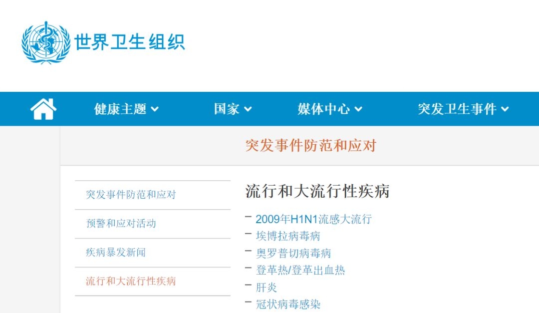 世界卫生组织上一次宣布全球性大流行病(Pandemic)是在2009年甲型H1N1流感暴发时。