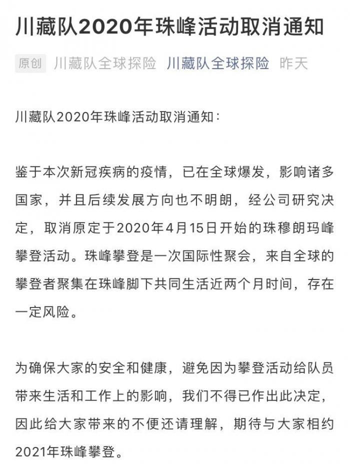 但3月11日,川藏队的官方微信号却发布“活动取消通知”,称“经公司研究决定,取消原定于2020年4月15日开始的珠穆朗玛峰攀登活动。珠峰攀登是一次国际性聚会,来自全球的攀登者聚集在珠峰脚下共同生活近两个月时间,存在一定风险。 ”