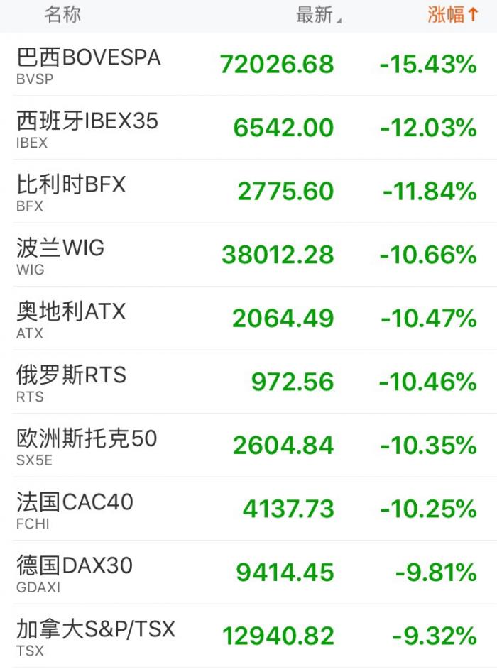 此外,欧美其他国家的股市也不容乐观。加拿大多伦多交易所暂停交易,股指下跌9.17%,触发一级市场熔断,恢复交易后,股指跌幅扩大至10.5%。