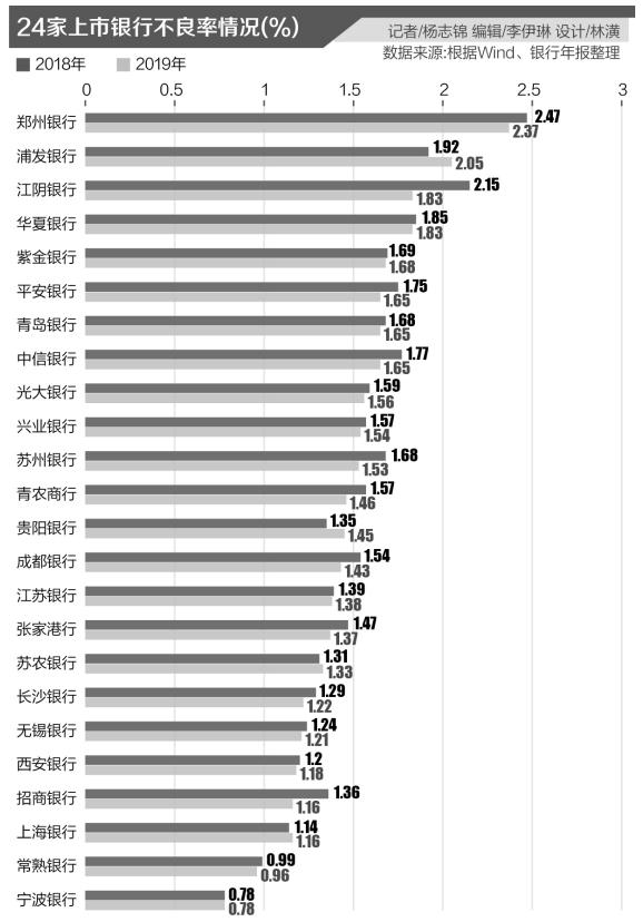 据21世纪经济报道记者梳理,24家上市银行中,不良率最高的为郑州银行(2.37%)。相比2018年来看,不良率下降的银行有19家,占比达八成。此外,4家银行不良率上升,1家不良率和上年持平。换言之,在经济增速下行的背景下,绝大多数上市银行资产质量却在好转。