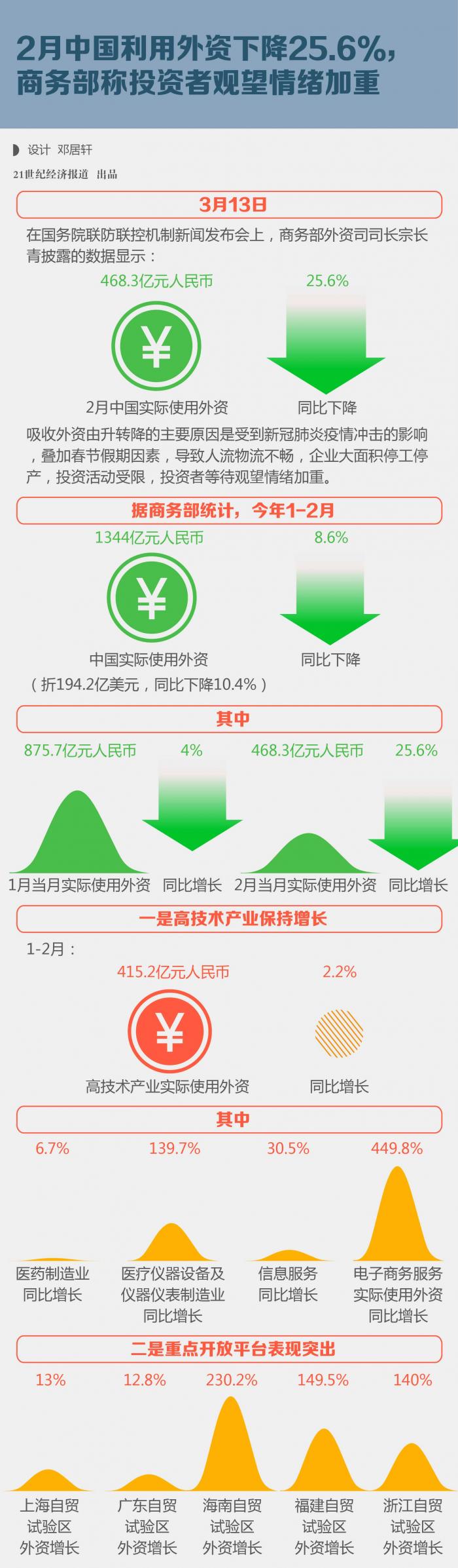 3月13日,在国务院联防联控机制新闻发布会上,商务部外资司司长宗长青披露的数据显示,2月中国实际使用外资468.3亿元人民币,同比下降25.6%,吸收外资由升转降的主要原因是受到新冠肺炎疫情冲击的影响,叠加春节假期因素,导致人流物流不畅,企业大面积停工停产,投资活动受限,投资者等待观望情绪加重。