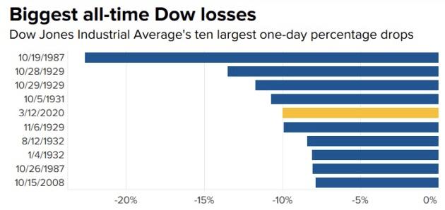 当地时间3月12日,美国总统特朗普对申根地区国家采取旅行禁令、欧央行未能如期降息令投资者大失所望,美股欧股全部进入熊市,其中美股在开盘后再度触发一级熔断,这是美股历史上第三次熔断、本周内第二次熔断。恐慌指数VIX飙涨40.02%,报75.47点,创2008年金融危机以来新高。截至收盘,道琼斯工业平均指数跌9.99%,报21200.62点,创1987年10月股灾以来的最大单日百分比跌幅;纳斯达克综合指数跌9.43%,报7201.80点;标普500指数跌9.51%,报2480.64点,正式跌入熊市。