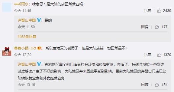 3月13日,许留山中国在其官方微博上回应,大陆门店正常营业,此前无法登陆系会员系统故障,现已恢复正常。