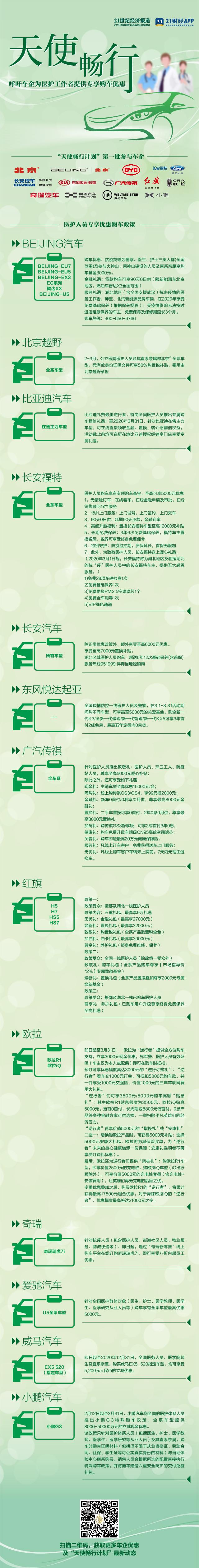 守护天使,畅行无忧!21世纪经济报道自推出“天使畅行计划”,呼吁车企为医护工作者提供专享购车优惠以来,获得业界积极响应,多家车企踊跃参与。21世纪经济报道将持续更新参与车企相关政策,为广大医护工作者提供优惠购车信息;同时,呼吁更多车企加入“天使畅行计划”。