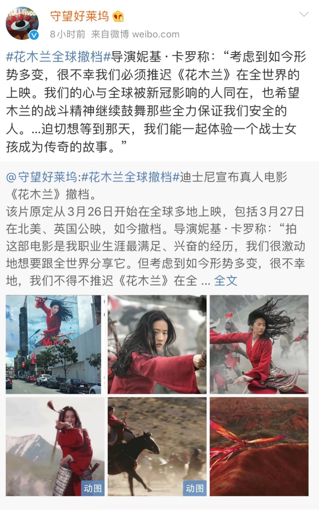 《花木兰》导演妮基·卡罗表示:“制作这部影片是我人生中最满意的一次体验。能够体验忠、勇、真的精神是一种幸运,但鉴于疫情我们要推迟上映了。”“因为疫情形势变化飞快,《花木兰》延迟上映,并祝愿木兰精神能够鼓舞奋斗在一线的医务人员。”